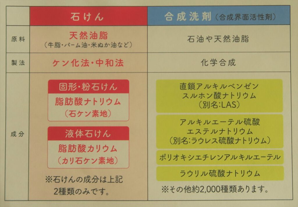 石けんと合成洗剤とでは、原料が同じでも製法が異なり、結果出来上がるものは全くの別物となります。